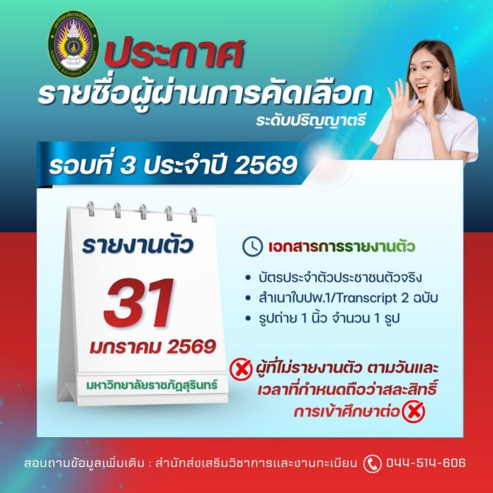 ประกาศรายชื่อผู้ผ่านการคัดเลือก รอบที่ 3 ประจำปีการศึกษา 2569 #DEKSRRU69