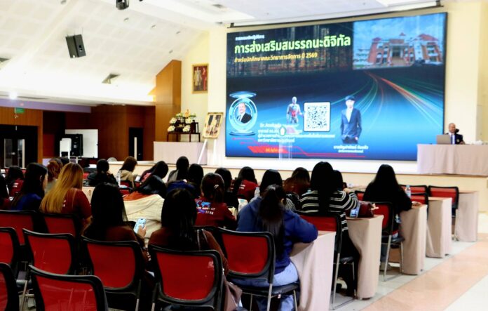 โดยได้รับเกียรติจาก อ.ดร.สมเกียรติ เพ็ชรมาก ผู้อำนวยการสำนักวิทยบริการและเทคโนโลยีสารสนเทศ มหาวิทยาลัยราชภัฏสุรินทร์ ให้เกียรติ เป็นวิทยากร บรรยายให้ความรู้เกี่ยวกับเนื้อหาสมรรถนะดิจิทัล ทั้ง 6 ด้าน