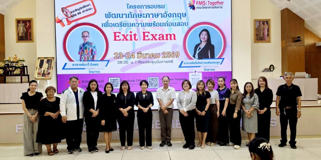 รองศาสตราจารย์ ดร.ชนม์ณัฐชา กังวานศุภพันธ์ คณบดีคณะวิทยาการจัดการ เป็นประธานเปิดโครงการอบรมพัฒนาทักษะภาษาอังกฤษเพื่อเตรียมความพร้อมก่อนสอบ Exit Exam คณะวิทยาการจัดการ มหาวิทยาลัยราชภัฏสุรินทร์ ประจำปี 2568 ระหว่างวันที่ 23-24 มีนาคม 2569 ณ ห้องประชุมบันทายศรี ชั้น 3 ได้รับเกียรติจาก อาจารย์นาวี รับพร และ อาจารย์หทัยรัตน์ จงเสริมตระกูล อาจารย์ประจำสาขาวิชาภาษาอังกฤษ คณะมนุษยศาสตร์และสังคมศาสตร์ มหาวิทยาลัยราชภัฏสุรินทร์ ร่วมเป็นวิทยากรในกิจกรรมดังกล่าว